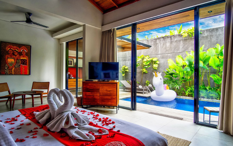 What could be more romantic than floating on an inflatable unicorn in a private pool... With rose petals scattered over the bed... And located close to the famous sunset beach, it's the perfect destination for honeymooners and romantic couples to celebrate love in style at Abia Villas.